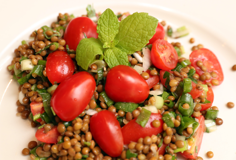 Ve větší míse smíchejte scezenou čočku Bonduelle Vapeur, nakrájená rajčata, jarní cibulku, bylinky a 4 lžíce olivového oleje.