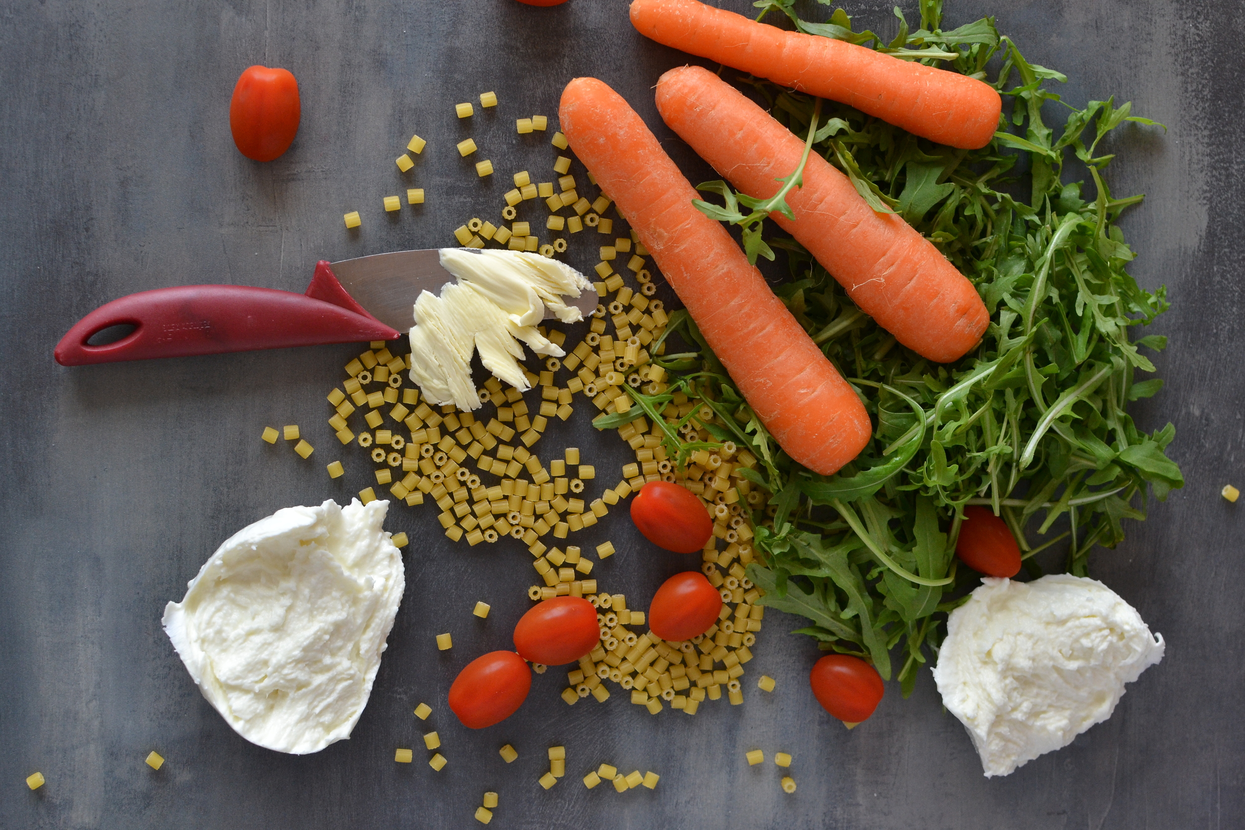 Uvařené, scezené těstoviny, dejte do mísy. Přidejte mrkev s pampeliškovými listy, nakrájená rajčátka, omytou a osušenou rukolu a natrhanou mozzarellu. Smíchejte, dokud jsou těstoviny ještě teplé. Mozzarella se lehce rozpustí.