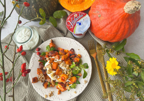 Pečená dýně se slaninou, ořechy a smetanovým jogurtem