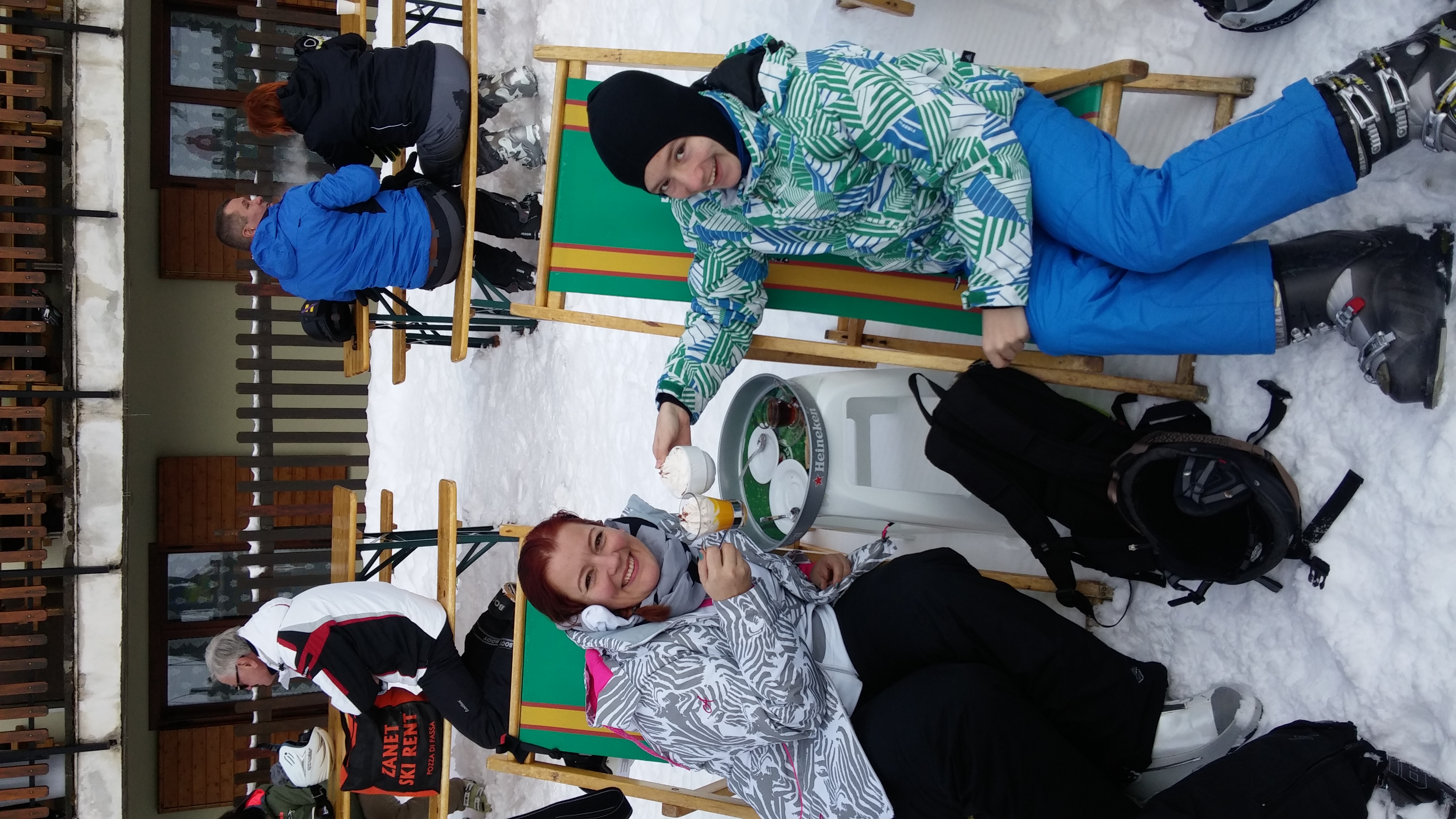 Tohle by nám šlo 🙂 Počasí bylo celou dobu nádherné a tak slunění na svahu s Aperol Spritz, horkou čokoládou, bombardinem nebo palačinkou, bylo na denním pořádku. I několikrát denně. Měli jsme svou oblíbenou odpočívárnu, kde jsme se vždycky v určenou hodinu všichni sešli. Protože naše rodinné lyžařské výkony jsou nevyrovnané. Já jsem všechny brzdila, takže jsem jezdila sama nebo jsem vyfasovala Toničku. Pepíno je zase nejlepší lyžař z rodiny, tak jezdil s manželem, který lyžuje taky skvěle nebo sám, když manžel jezdil s Toničkou. Různě jsme to mixovali.